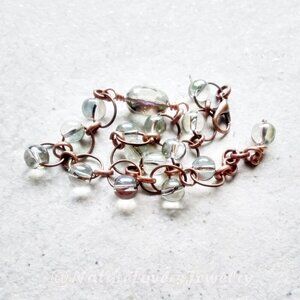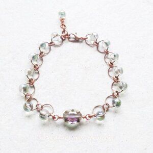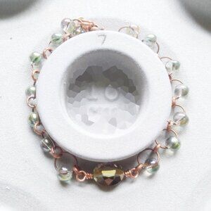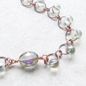 Beautiful, translucent, shimmering glass beads with an AB finish [aurora borealis] with copper rings and a faceted center stone that reflects in the same color hues. It's a relaxed fit for a 7" wrist with a small extender chain and can comfortably go to 7.5" or a touch more in wrist size.