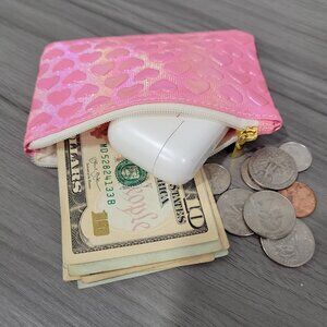 Adorable and stylish heart-pattern mini purse in shimmering pink tones. Made from soft synthetic leather with a smooth zipper closure, this compact wallet is perfect for carrying coins, cash, cards, AirPods, or keys. Its portable size makes it ideal for everyday use, while the chic heart design adds a playful touch. A practical accessory for yourself or a thoughtful gift.