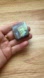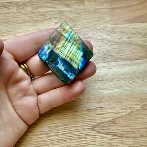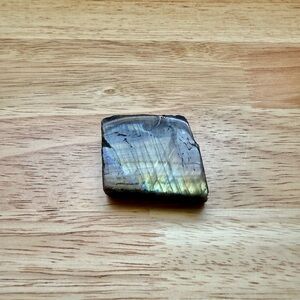 Polished labradorite slab with strong iridescent flash with blue, gold, orange tones.. Smooth face with natural striations and rough back.