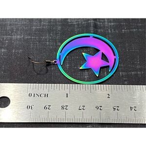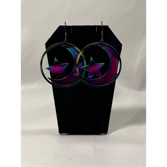 Iridescent Light Weight Moon and Star Brass Colored Fish Hook Stud Earrings #341