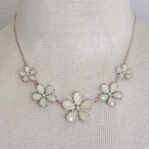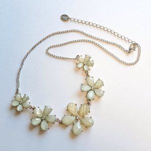 Five linked flowers in a pale yellow-green iridescent acrylic, with rhinestone centers