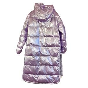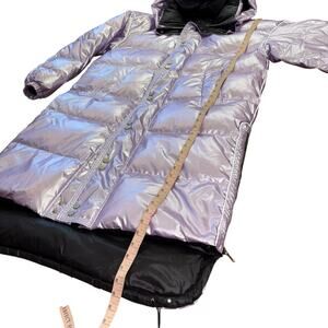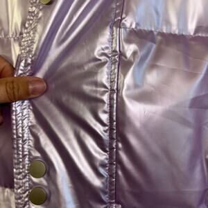Stay warm and stylish with this iridescent purple puffer coat. Perfect for chilly days, this coat combines fashion and function.