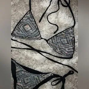 Iridescent rhinestone bikini from fashion nova size medium now sold out on website. Brand new missing one gem on right side barley noticeable though they are so small.
