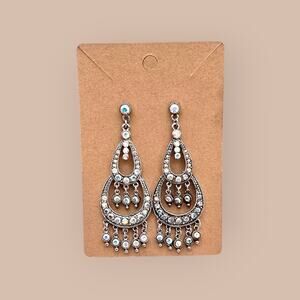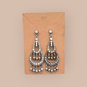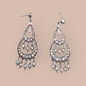 Add a touch of sparkle to your evening look with these elegant chandelier earrings featuring shimmering iridescent rhinestones set in silver-tone metal. The intricate teardrop design is accented with delicate dangling charms that catch the light beautifully with every movement.