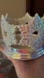 Beautiful! Iridescent colors changes colors depending on the lighting! Really excellent condition! The bottom got a little dirty from sitting in the hutch but displayed on one holiday one time! No chips or cracks looks and feels like porcelain. Substantial and solid. Snowflake design and sought after! PRETTY!