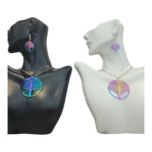 This is an absolutely stunning metal alloy Tree of Life earrings and necklace set. These are simply stunning and change depending on how the lights hit them. They are multi-colored with a multitude of rainbow colors mostly focused on the blues, purples, and greens. It is reminiscent of an oil slick. These are a super lightweight and delicate earring that are going to be more comfortable wearing all day.