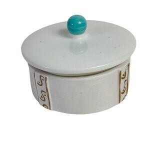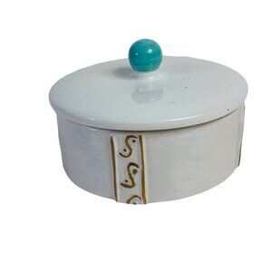 trinket box, vanity dish, dresser box, regency, ceramic container, vintage storage, white and gold, turquoise knob, decorative box, jewelry box, keepsake container, ceramic decor, small storage, elegant trinket holder, collectible box, home decor, gift idea
