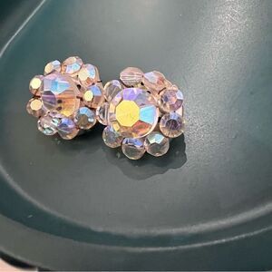 Iridescent Vintage MCM Aurora Borealis Crystal Beaded Cluster Clip On Earrings. Excellent gently used condition. Roughly .75” x .75”.