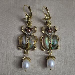 Iridescent abalone shell scarab beetle glam earrings with synthetic drop pearls