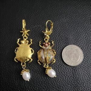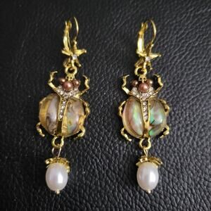 Iridescent abalone egyptian scarab beetle glam earrings with synthetic pearls