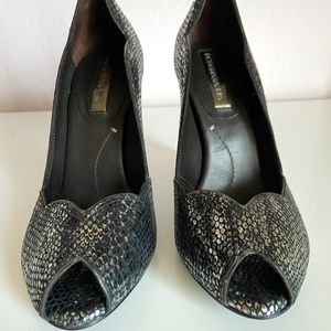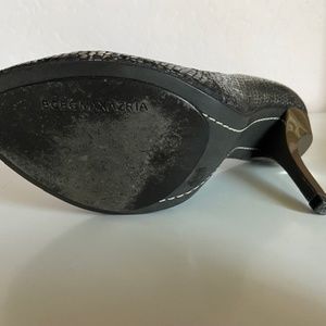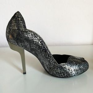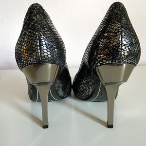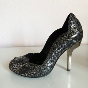 Only worn once! Beautiful BCBG iridescent, black and silver snakeskin stilettos, with flecks of gold and blue. Sexy 4" chrome "comma" heels. Perfect for an evening out on the town.