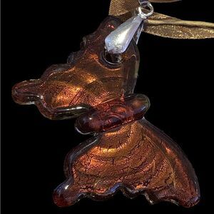 Beautiful large glass butterfly pendant in shades of pink lavender blue green snd silver iridescence. The pendant hangs on a silver bale and has both metallic ribbons and woven cords. Necklace measures 16” , pendant 2.5” and 2” extension. New never worn beautiful and unusual necklace, please see all photos for full description.