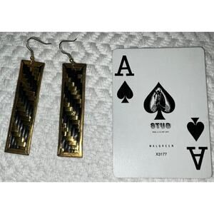 These new, old stock Iris Apfel & Bajalia earrings are a stunning statement piece. Featuring a black and gold woven design in a rectangular drop style, they exude boho chic.