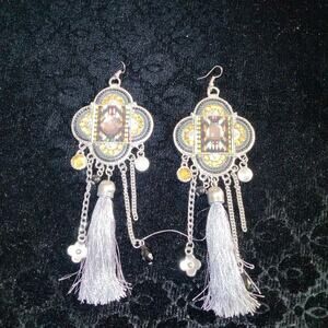 Gray & Silver Embellished Tasseled HUGE Statement Earrings