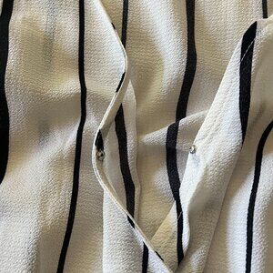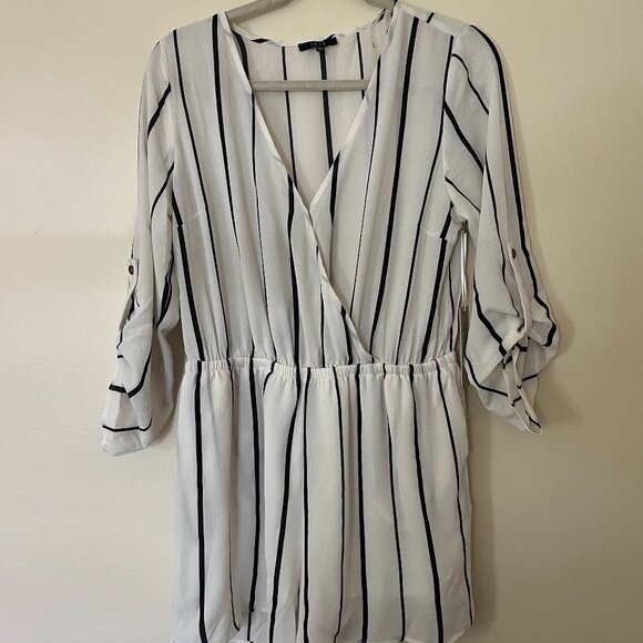 Iris Basic Romper NWT. Ivory and black striped 3/4 roll tab sleeve. Size L. Convenient pockets in each side. Lightweight material. Bottoms are lined for comfort.