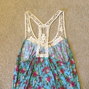 Cinched bottom, soft blue and pink material, off white lace top-perfect condition, only worn twice