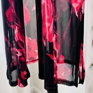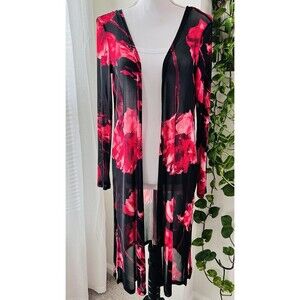 Iris Black & Red Rose Floral Sheer Lightweight Stretchy Duster Cardigan - Small