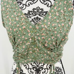 Iris Green Floral Ruched Crop Top Button Front Tank with Adjustable Ties