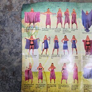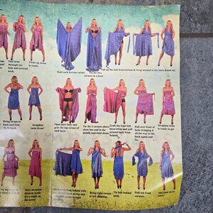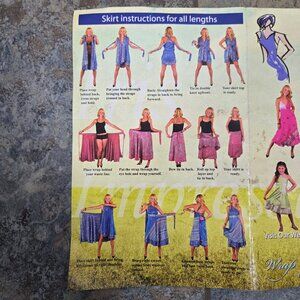 Black convertible dress/skirt has many ways to be worn. The instructional booklet gives pictures and instructions on how to drape and tie this piece in 9 different styles. The piece consists of two layers of fabric (the tier is 8 inches shorter than the longer one) with long ties at each end of the top. There is a stitched hole in the middle of the "waistband" for a tie to pass through. The option to convert this piece in so many ways makes it ideal for traveling.