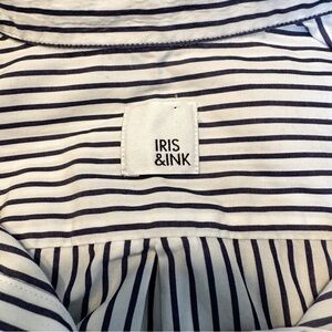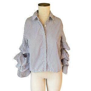 This is a black and white striped Iris & Ink blouse with open sleeves with stacked ruffles. The ruffles are attached by ties/straps. It is collared and has a high low hem.