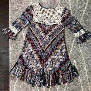 Adorable boho prairie peasant dress by Iris & Ivy! In great condition! No holes or stains. Love the navy, pink and tan color combo and crocheted lace details. 14” pit to pit, 29” length, 15” sleeve