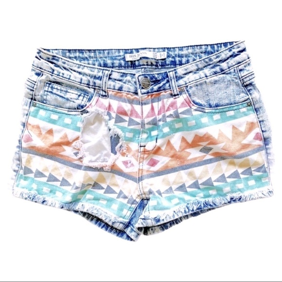 Light wash Iris Jeans distressed jean shorts, size 7. Aztec print on front, classic five pocket design, double front and back pockets. No staining. 98% cotton/2% spandex. All measurements are approximate and shown in last photo.