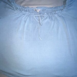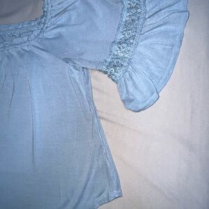 Chic and comfortable light blue off-shoulder top with lace detailing. Perfect for casual outings.