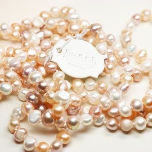Gorgeous “peaches and cream” Baroque style pearl necklace by Iris & Lily features freshwater pearls on a lariat length hand strung necklace with no clasp. This piece measures approximately 63”L and the pearls are 5mm - 7mm. This piece is sold new with tags and would be an excellent gift. Please be sure to take a look at the dozens of futures, freshwater and simulated pearl necklaces available in our closet/boutique.