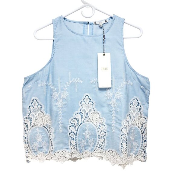Iris Los Angeles Blue Sleeveless Crop Top With Lace Embroidery Womens Size Large