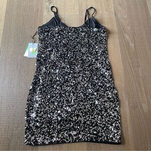 Turn heads in this stunning new with tag Iris Los Angeles Sexy Shimmer Sequin Mini Dress, a glamorous addition to your wardrobe. The black and silver sequins create a captivating look, perfect for a night out or a special event. This dress is in a flattering Size L.
