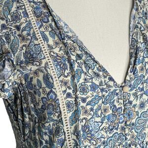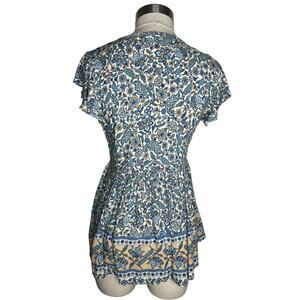 A sweet boho top with a tassel tie at neckline and a V neck with buttons. Blue/yellow floral. Short flutter sleeves. Slightly hi-low hem.