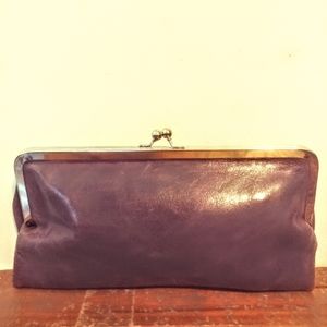 Beautiful large clutch from Iris Tyler, made from dark lavender leather with a silver kisslock closure and map print fabric lining. Features an ID holder, 2 slide pockets and 6 card slots. Never used with tags still inside, but there is minor wear from storage, including lught scratches and fading along the edges.