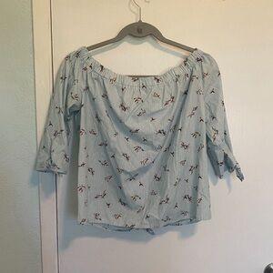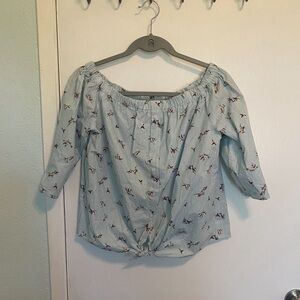 Iris Women’s Crop Pheasant Boho Bird Print Front Knot Tie Half Sleeve Top Sz S
