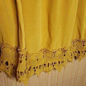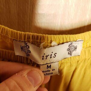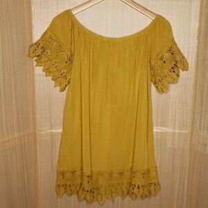 Iris womens gold silky tunic with elastic off the shoulder and lace trim detail medium. Gently used condition. Measurements are: 28” from shoulder to hem, and 18 ½" from armpit to armpit.