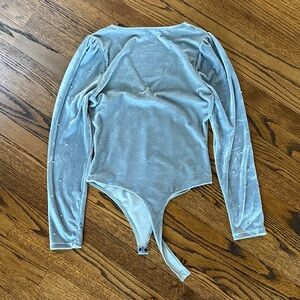 Elegant sky blue velvet bodysuit. Adorned with delicate pearl details. Features long sleeves and a flattering V-neckline. Ideal for chic occasions.
