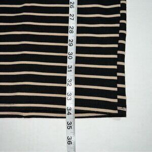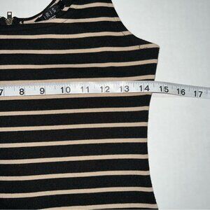 Iris body on tank dress in size medium. Tan and black striped dress. Hourglass shaped dress with a back zipper closure. Beautiful and flattering fitted dress with a round neckline. The material isn’t heavy but it also isn’t thin. I’m great condition 85% polyester 11% rayon 4% spandex. There ain’t a ton of stretch