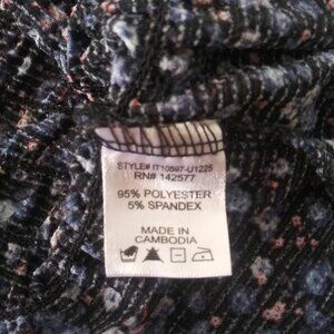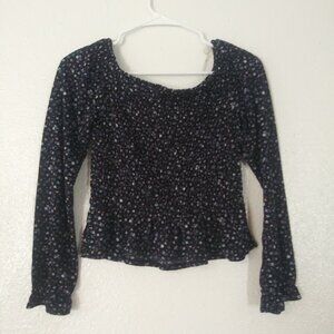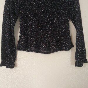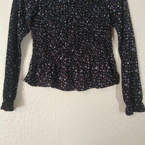 Iris Black, blue, and pink floral long sleeve blouse, peasant sleeves, pull over, smocked