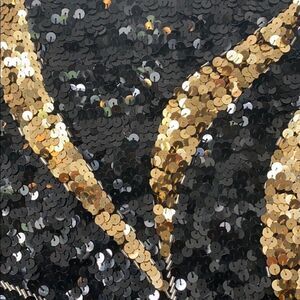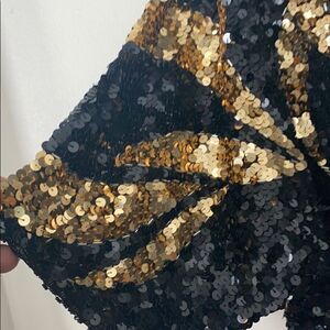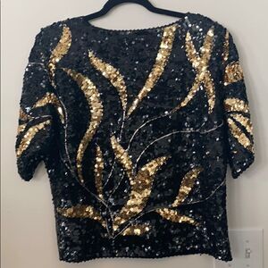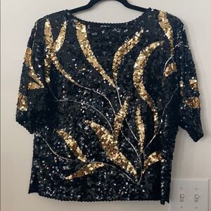 Beautiful elegant sequined top in black & gold pattern. Has shoulder pads. Just in time for your holiday party.