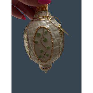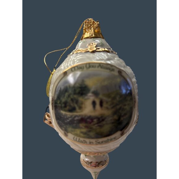 This exquisite Irish Blessings ornament weaves tales of heritage and artistry. Glazed porcelain with gold accents frames a scenic design. A timeless treasure.