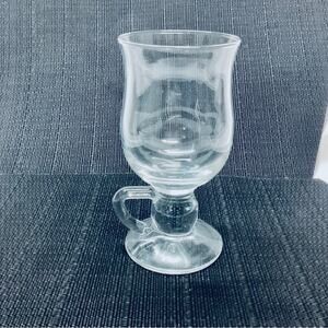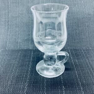 Clear glass stemmed Irish coffee glass. Good preowned condition. No chips or cracks.