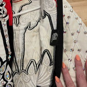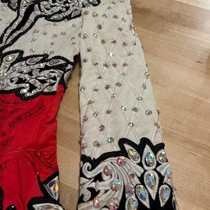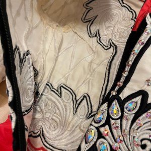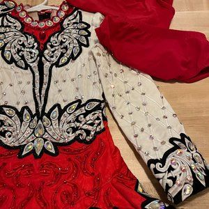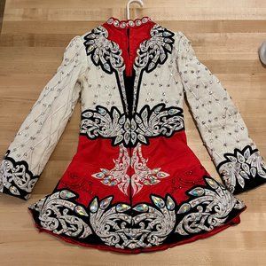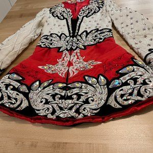 Age 9-11yr, Novice to Prelim. Eire Designs by Gavin. Red, White, Black Solo Dress. Gently used. Comes wit crown, Capezio kick pants and tank