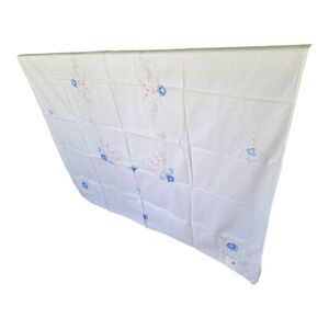 Never used, White linen rectangular handmade tablecloth with eight napkins. Purchased by a family during an Ireland trip quite a few years ago. Not stark white. Tag is actually straight-pinned to the tablecloth. Delicate floral embroidery and appliques of blues and pink (slight coral tint). The matching napkins each feature one embroidered pink/coral flower in a corner (final three photos). Due to a smudge, one napkin has been gently laundered and washed up beautifully.