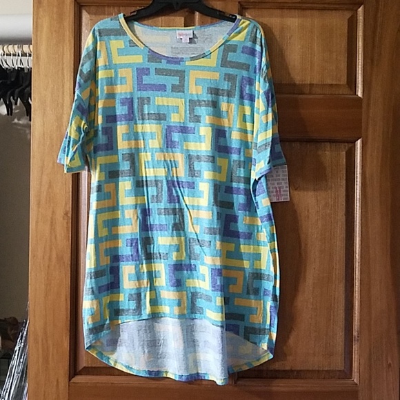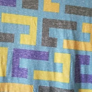 Medium, light blue background with an orange, yellow, purple, and grey design.