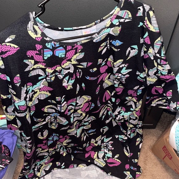 XL lularoe Irma top. Black background. Purple, white, yellow, mint, blue design colors. Slight piling noted in one picture which is due to top of fabric but could use fabric razor to remove. In excellent used condition. Washed and dried per LLR guidelines