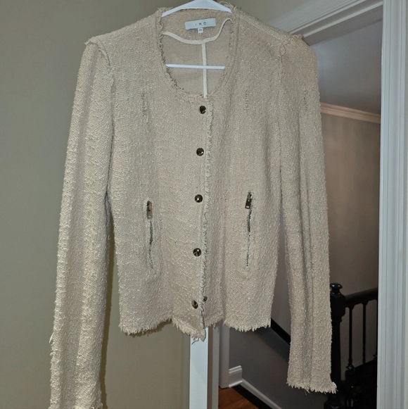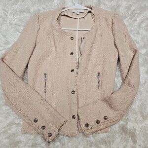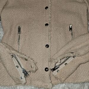 Elegant cream jacket with textured fabric. Features button front and zip pockets. Worn a few times. Size Small