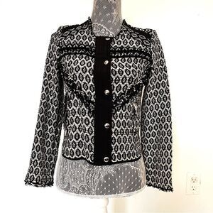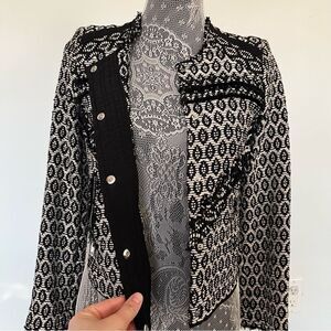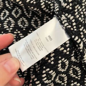 Gorgeous button front blazer by iro. Black and white tweed design with all over accenting make this unbelievably chic. Dresses up and down well. Great preowned condition without any significant flaws. Lying flat armpit to armpit approx 16” across and top of shoulder to bottom hem approx 20” in front and 18” in back. All measurements are approximate