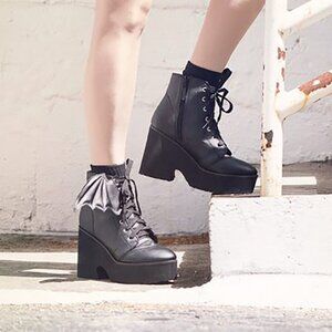 Spend your nights stomping 'round the streets with Iron Fist attitude in these lace-up bad boy boots. Detachable bat wing details mean you can choose when you want to vamp it up and that platform sole is gonna keep you standing out, high above the crowds.
