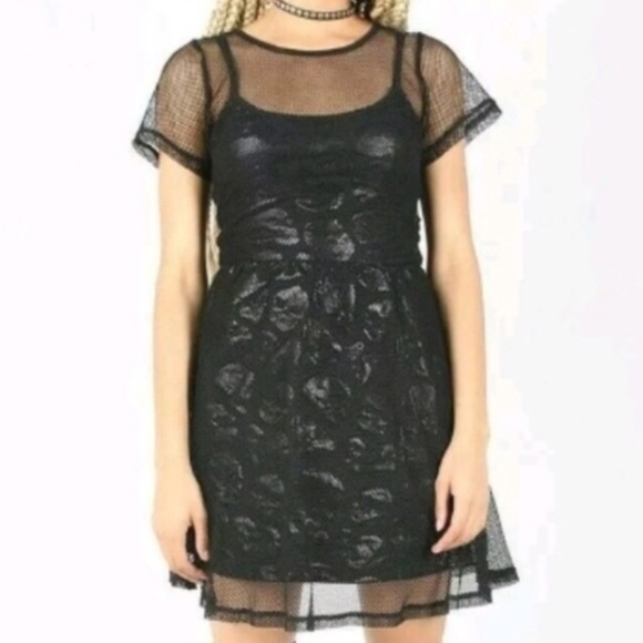 Stylish black dress with mesh overlay. Short sleeves and fitted design. Perfect for a night out.