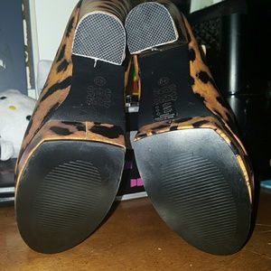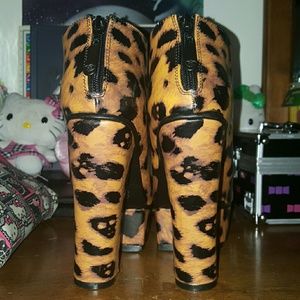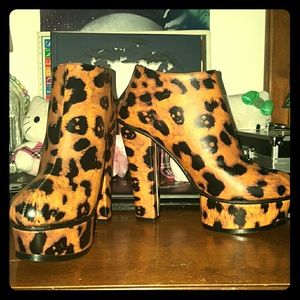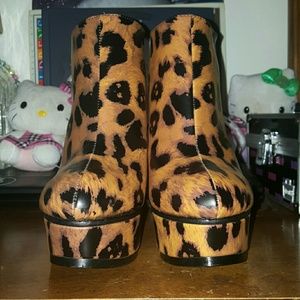 Unique leopard print ankle boots with skulls mixed in with the leopard spots. 5 in heel 1.5 in platform. Zip up the back. Sizes 5 and 6 have the box and extra heel bottoms, size 9 does not. I thought I was going to keep those, but it turns out my feet grew a size while I was pregnant and I can't wear them :-( so they're nwob, but will be packed and shipped safely, no worries