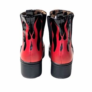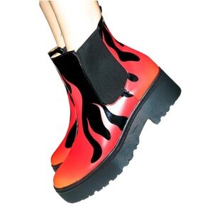 These fired up boots are constructed from super smooth soft vegan leather with an easy pull-on back tab and elastic sides. Featuring a flaming hot graphic with textured 1.5” platforms and chunky 2.5” heels perfect for walking thru the flames 🔥